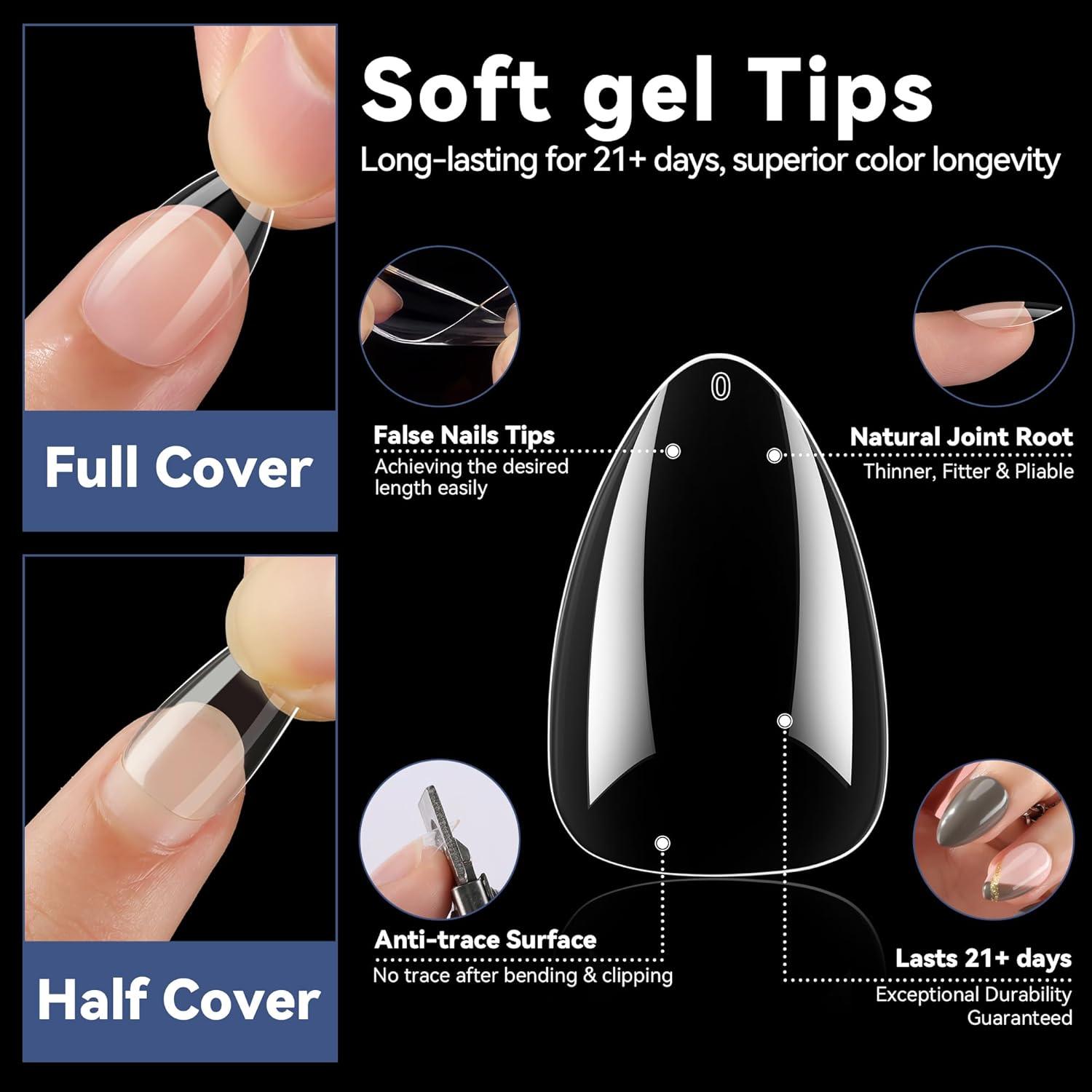 UNA GELLA Almond Gel Nail Tips, 504PCS Pre Etched Clear Fake Nails Tips Medium Almond Shape – 12 Sizes Full Cover Soft Acrylic Press On Nail Extensions No C Curve Gift for Diy at Home(A0-Medium Almond)