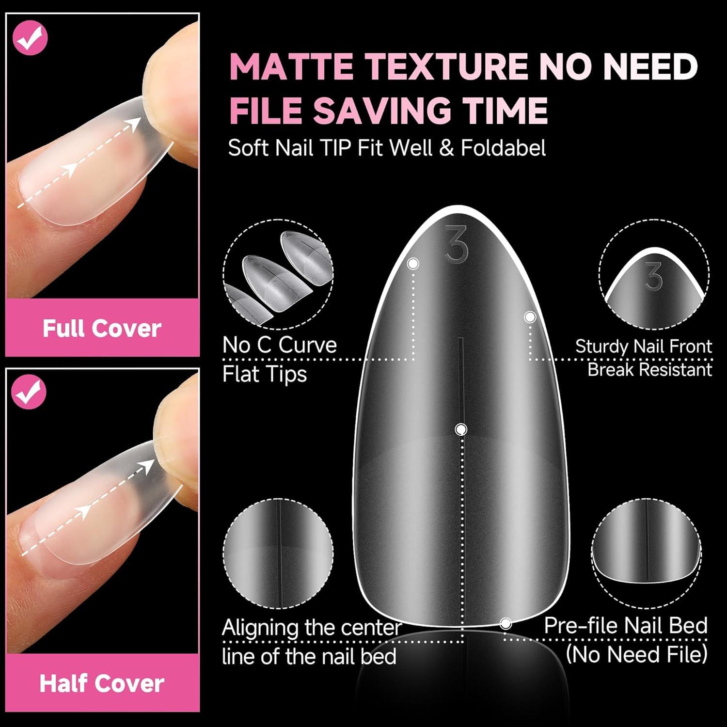 UNA GELLA Extra Short Almond Nail Tips, 504 Pcs Pre-Filed XS Almond Gel Nails, 12 Sizes Half Matte Full Cover Press Ons for Nail Extension Manicure Home DIY Salon(2Pcs Gel Nail Glue)