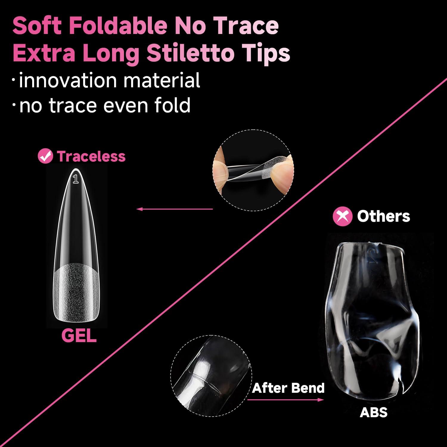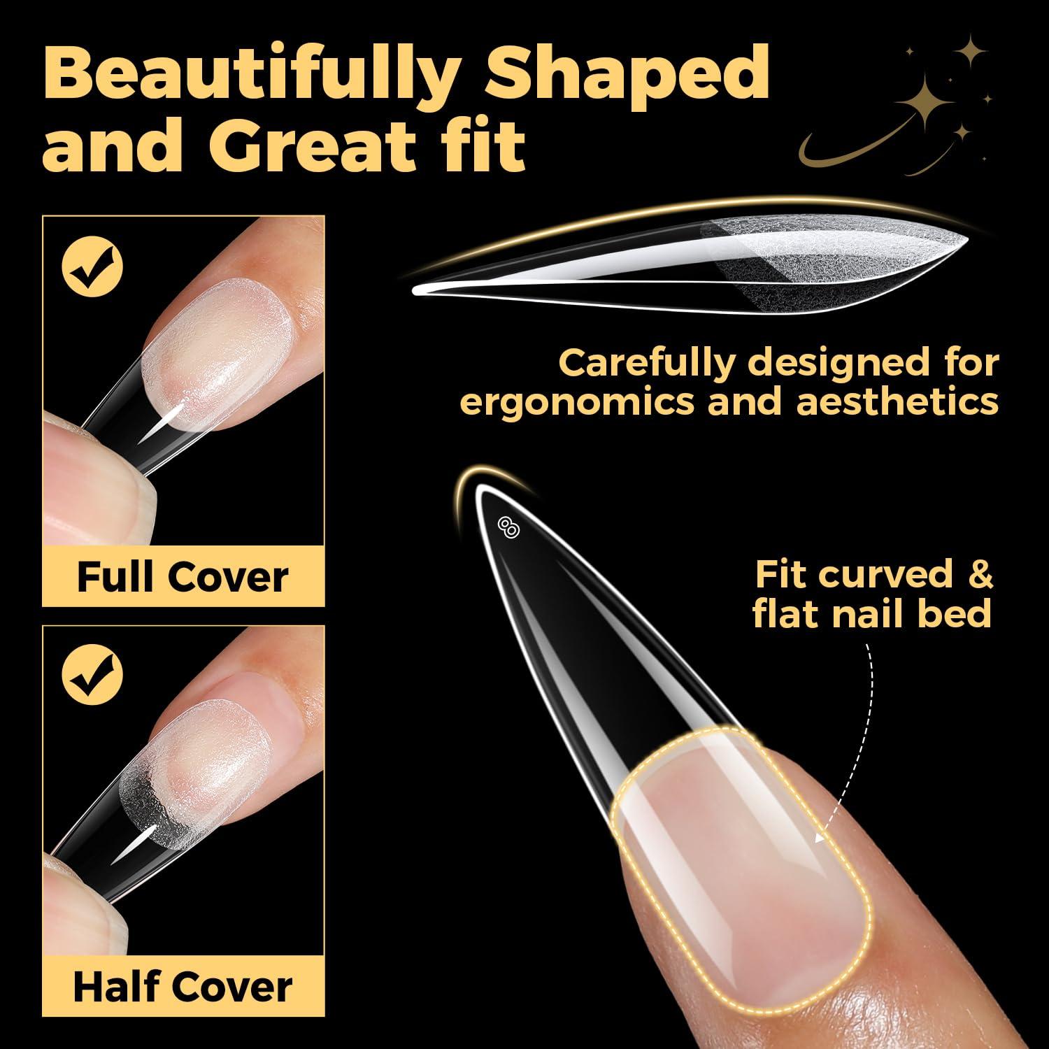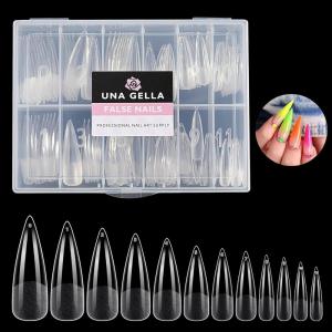 UNA GELLA Almond Gel Nail Tips, 504PCS Pre Etched Clear Fake Nails Tips Medium Almond Shape – 12 Sizes Full Cover Soft Acrylic Press On Nail Extensions No C Curve Gift for Diy at Home(A1-Long Stiletto)