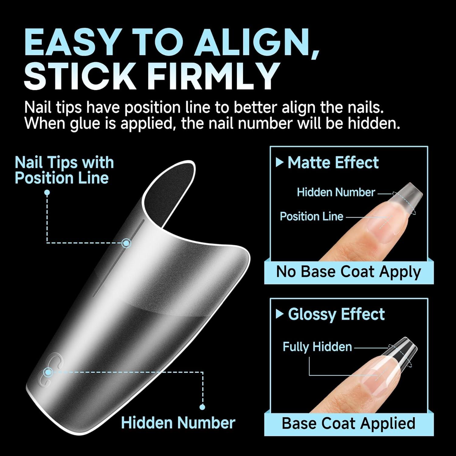 UNA GELLA Nail Tips Sqaure Extra Long Tapered Sqaure Nail Tips 504pcs XXL Clear Fake Nails Full Cover Square Gel Tips for Acrylic Nails Tips for Press on Nail Extensions Home DIY Salon 12 Sizes(A-Gel Nail Glue)