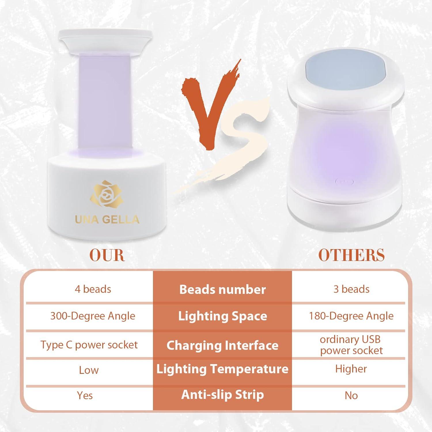 Universal Gel Compatibility: UNA GELLA Nail Lamp with 4Pcs dual light source beads, USB cable and touch switch, which has been specially designed for application of all types of nail art gel products in a mere 1 minute! No matter when or where enjoy the fun of perfect salon-quality gel nails DIY with UNA GELLA.