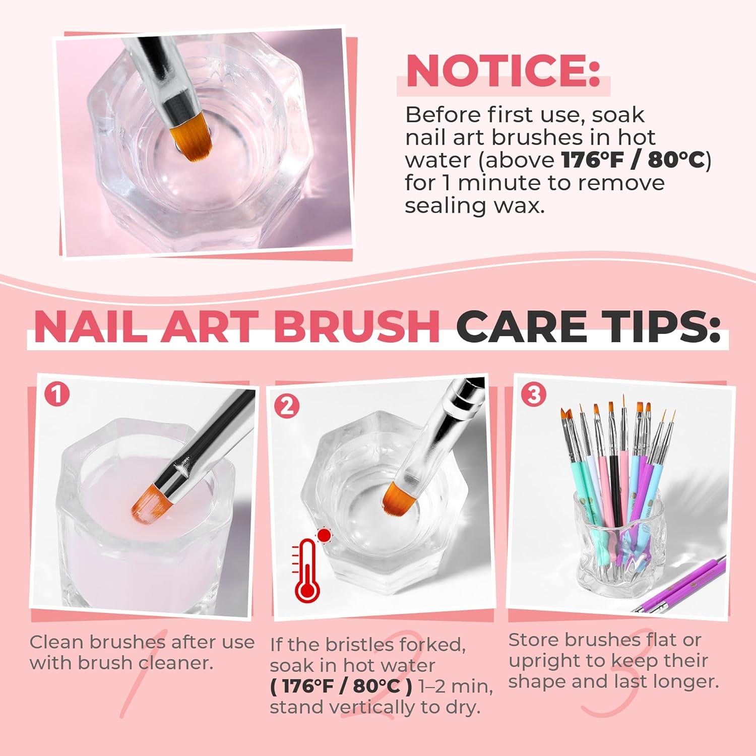 ❤️【Usage Tips】To extend the lifespan of your nail art brushes, soak them in hot water for 1–2 minutes before first use to remove the protective wax. Clean the nail polish pens promptly after each use, cover with the cap, and store upright or flat in a cool, dry place