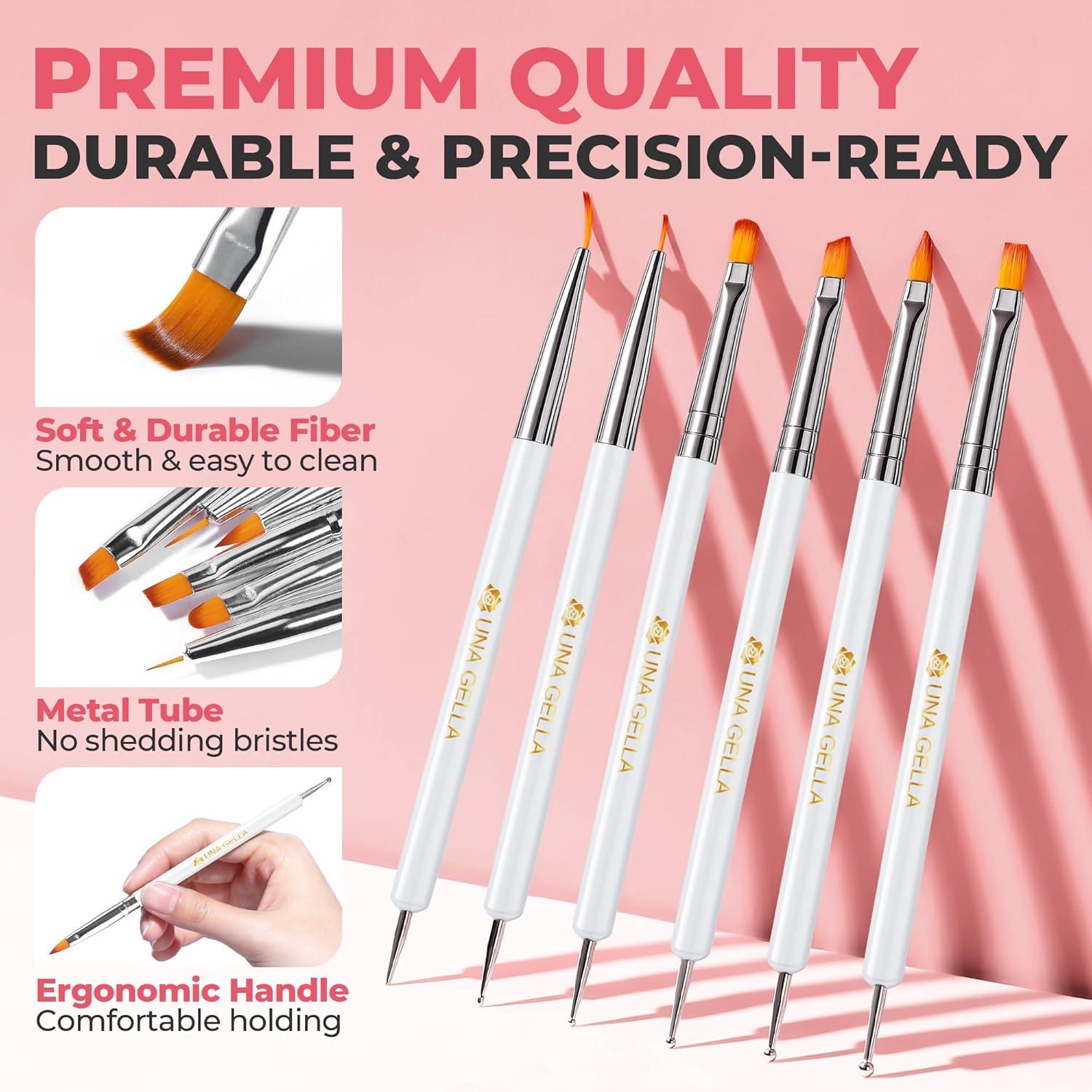 UNA GELLA Nail Art Brushes Set 6PCS White Color Nail Design Painting Brush Set Nail Dotting Tools Double-headed Nail Art Builder Gel Polish Liner Brushes for DIY Nail Drawing Supplies(White)