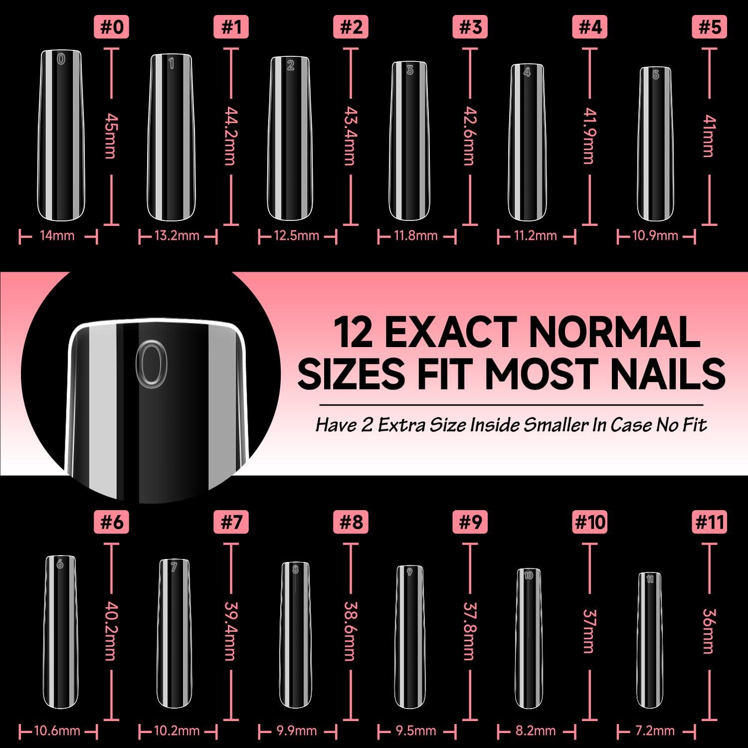 ✨【12 Sizes for Universal Fit】Designed with 12 carefully curated sizes (504 pieces total), these square tips comfortably fit most nail beds, whether you have petite or wide nails. Designed in an extra-long square shape, these gel tips offer endless styling possibilities for nail enthusiasts and professionals.