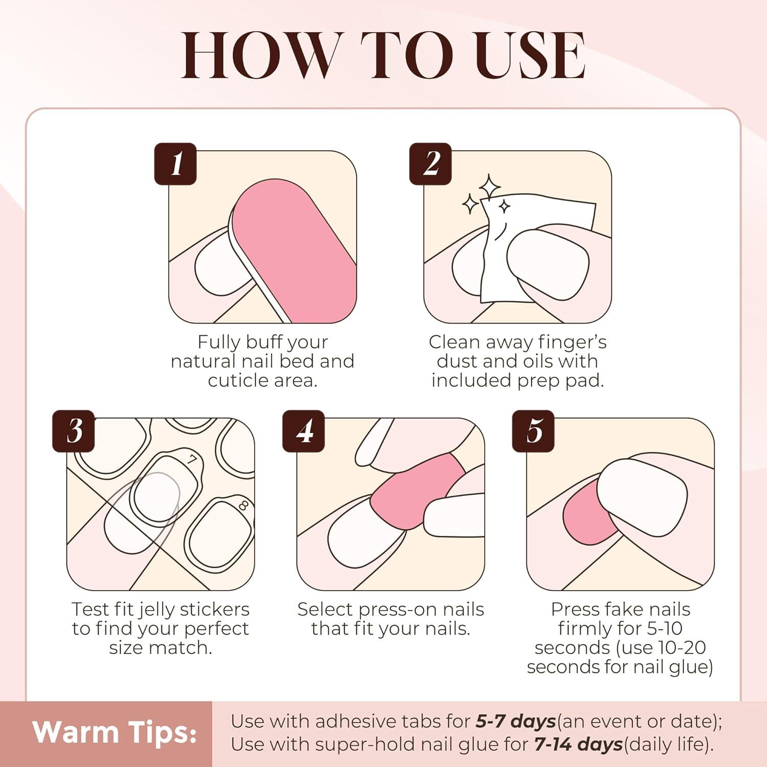 Salon-Gel Quality, At Home: Our press-on nails are crafted like a professional manicure. Each layer—from base to color and design—is applied with genuine gel polish, not simple printed ink. This means rich, hand-painted color and a durable, high-gloss finish that lasts. Get salon-perfect nails in just 5 minutes.