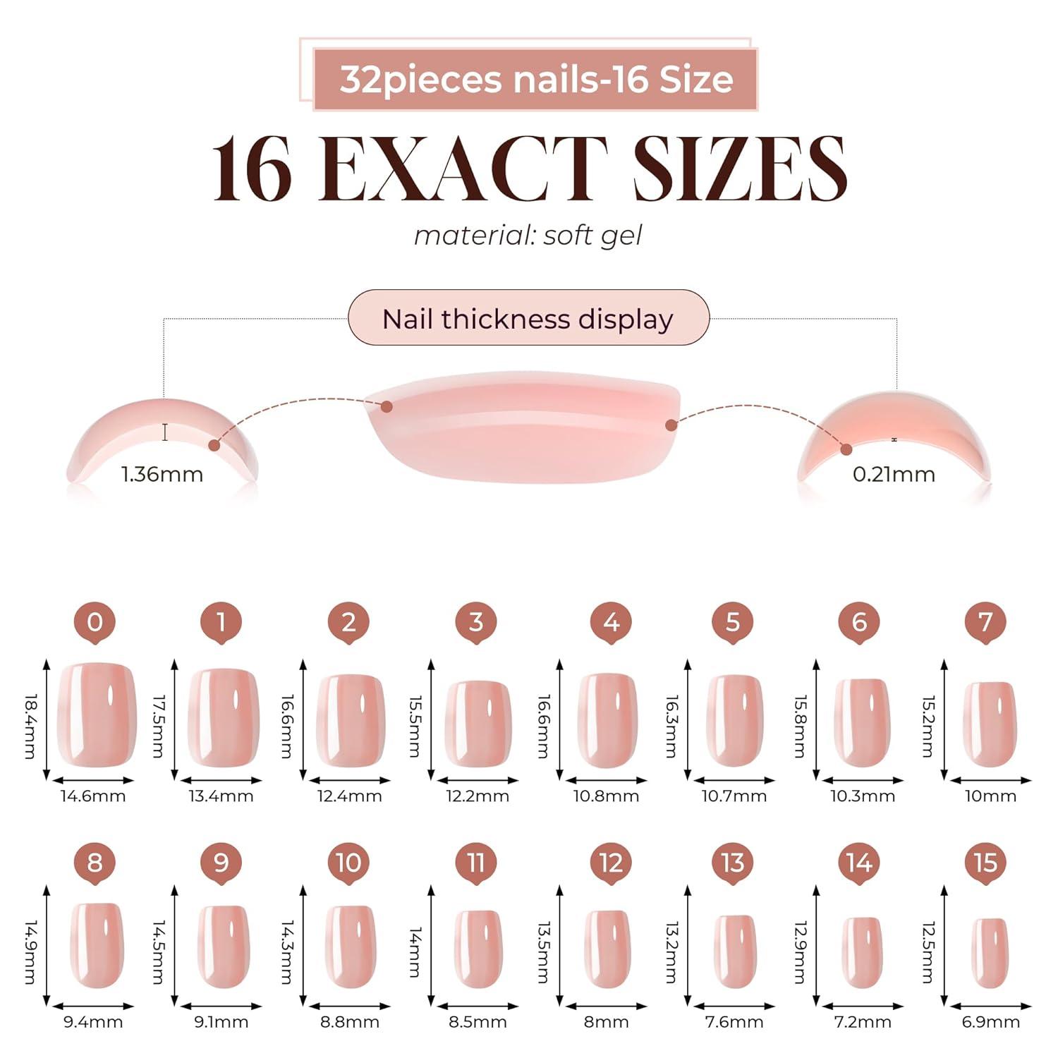 UNA GELLA Short Square Press On Nails: Nude Soft Gel Press Ons Short with Nail Glue, 16 Sizes – 32 Reusable Fake Nails Kit, Skin Tone Nude(Chrome Nude)