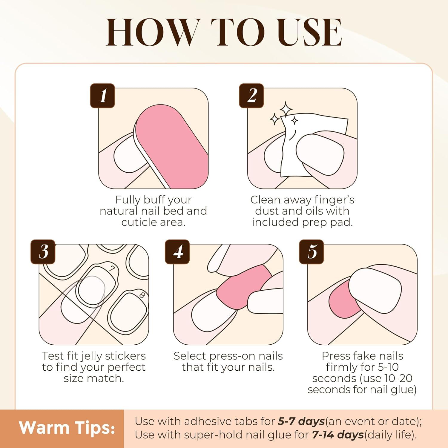 Everything You Need for a Flawless Application: Find your perfect match from 16 custom sizes. Each set comes with a wood cuticle stick, prep pad, double-sided file, nail glue, adhesive tabs, and a convenient storage box.