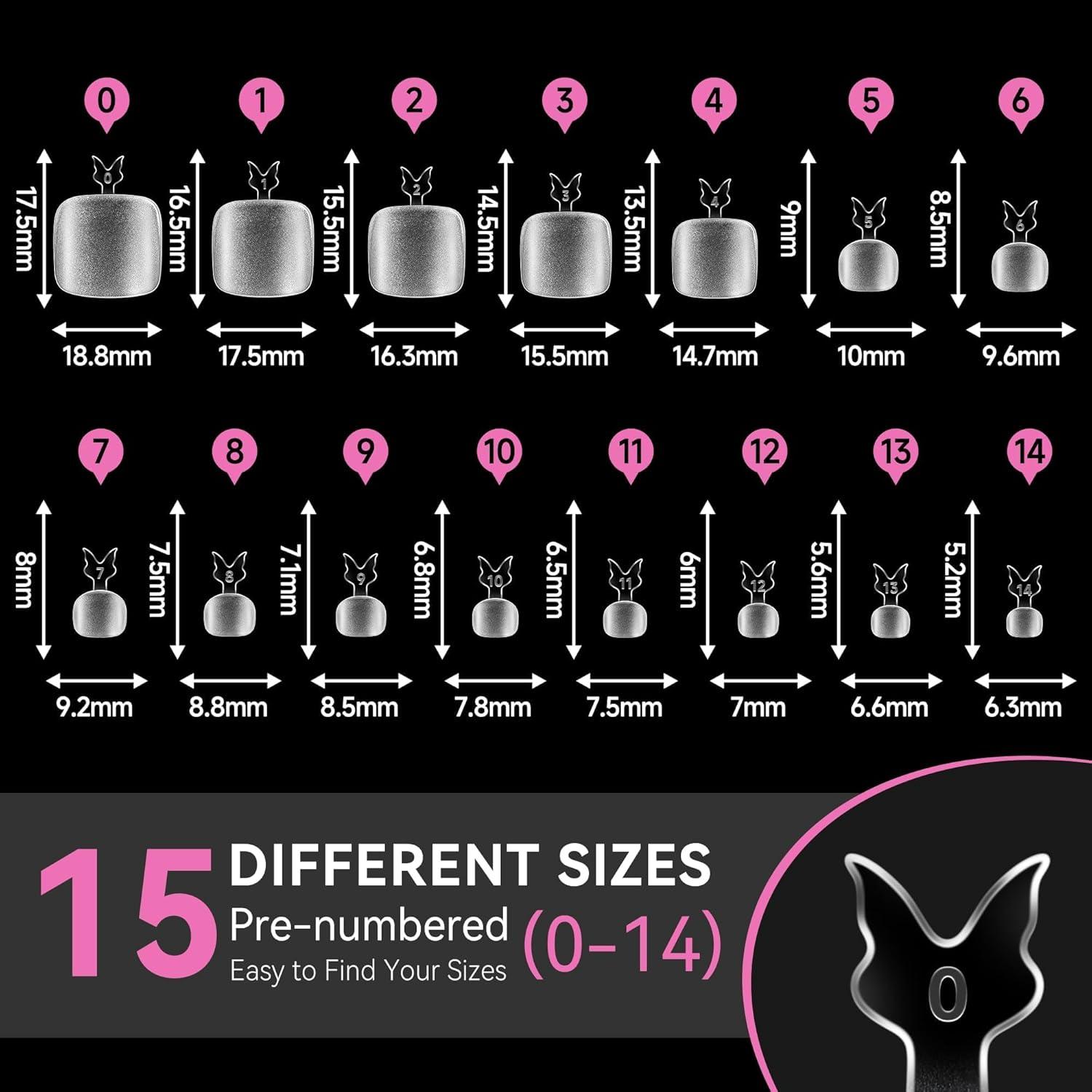 ✨【15 Different Sizes】Each press on toenails features a butterfly handle labeled “0–14”, offering 15 different sizes to fit most nail beds—especially wider toes. The handle design makes even the smallest nail tips for toes easy to pick up and apply with precision.