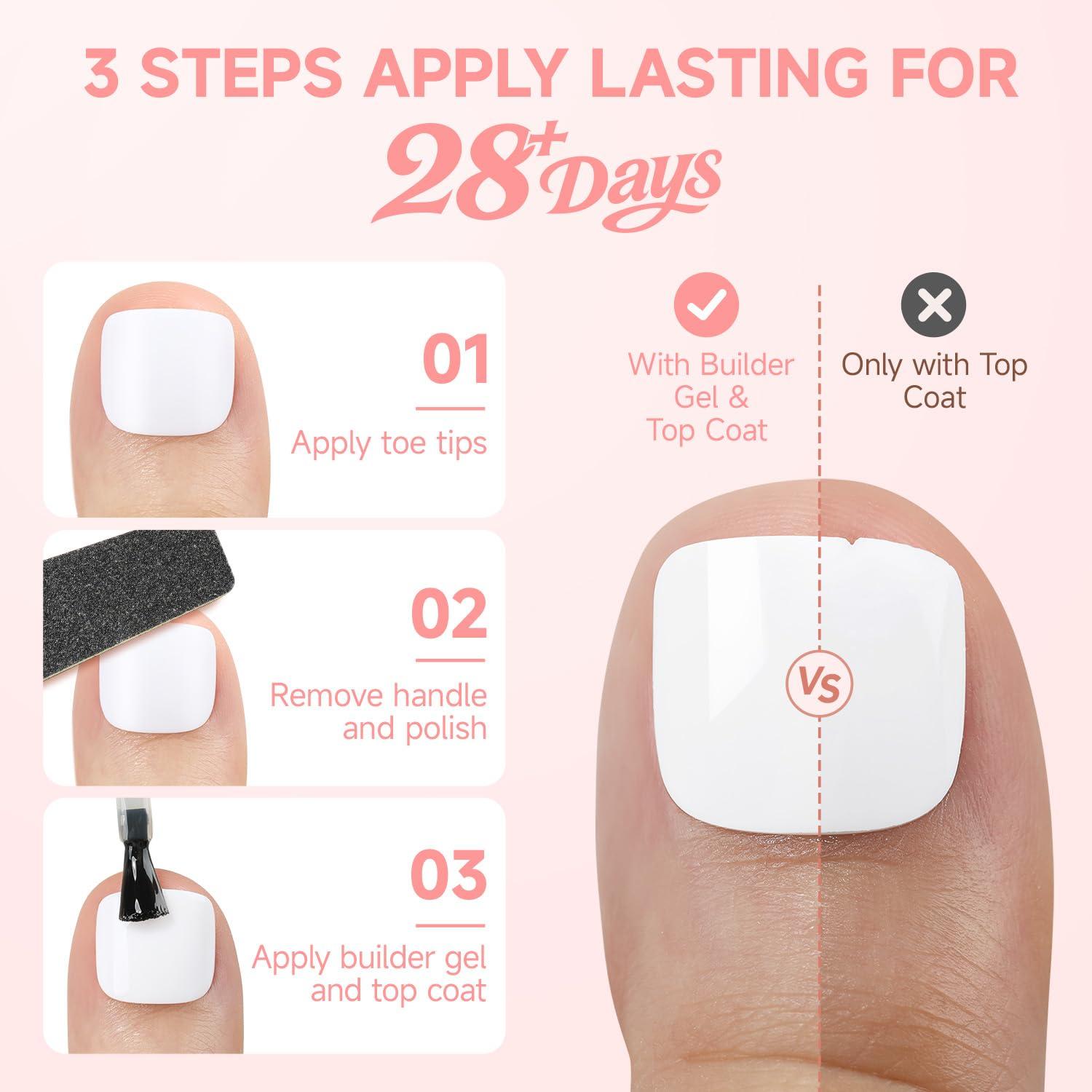 💗Quick Start: Our toe nail press ons are pre-coated with base coat and primer for a matte inner, oil-free surface that boosts glue adhesion and prevents lifting. Just apply nail glue and top coat—or add a builder gel layer for 28+ days of apply